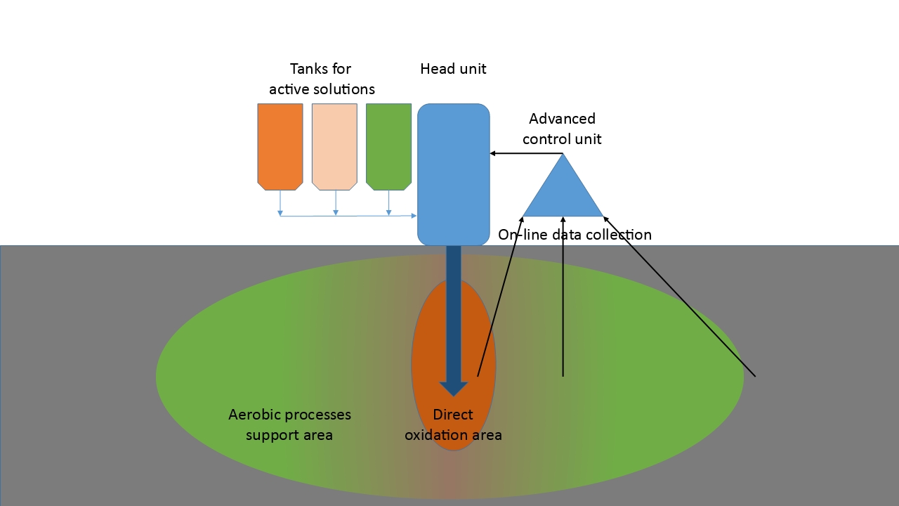 Technologie je založena na kontrolované a cílené aplikaci látek s vysokým potenciálem uvolňování kyslíku, jako jsou kapalné, či tuhé peroxidy, do horninového prostředí. Jedná se o proces s vysokým potenciálem odstranění přítomných kontaminantů pomocí přímé oxidace a návazné podpory aerobního biologického dočištění.